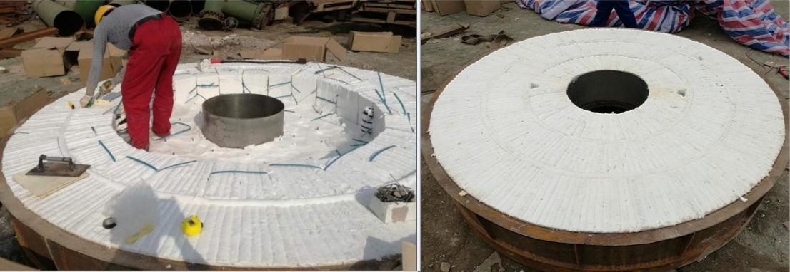 鋼包蓋保溫:使用導熱慢、比熱小的纖維模塊,替代導熱快、比熱高的重質澆注料,減少儲熱散熱損失,保護蓋頂儀表設備。鋼包蓋外表面溫度可從400℃降至80℃,燃料節約3%到5%。